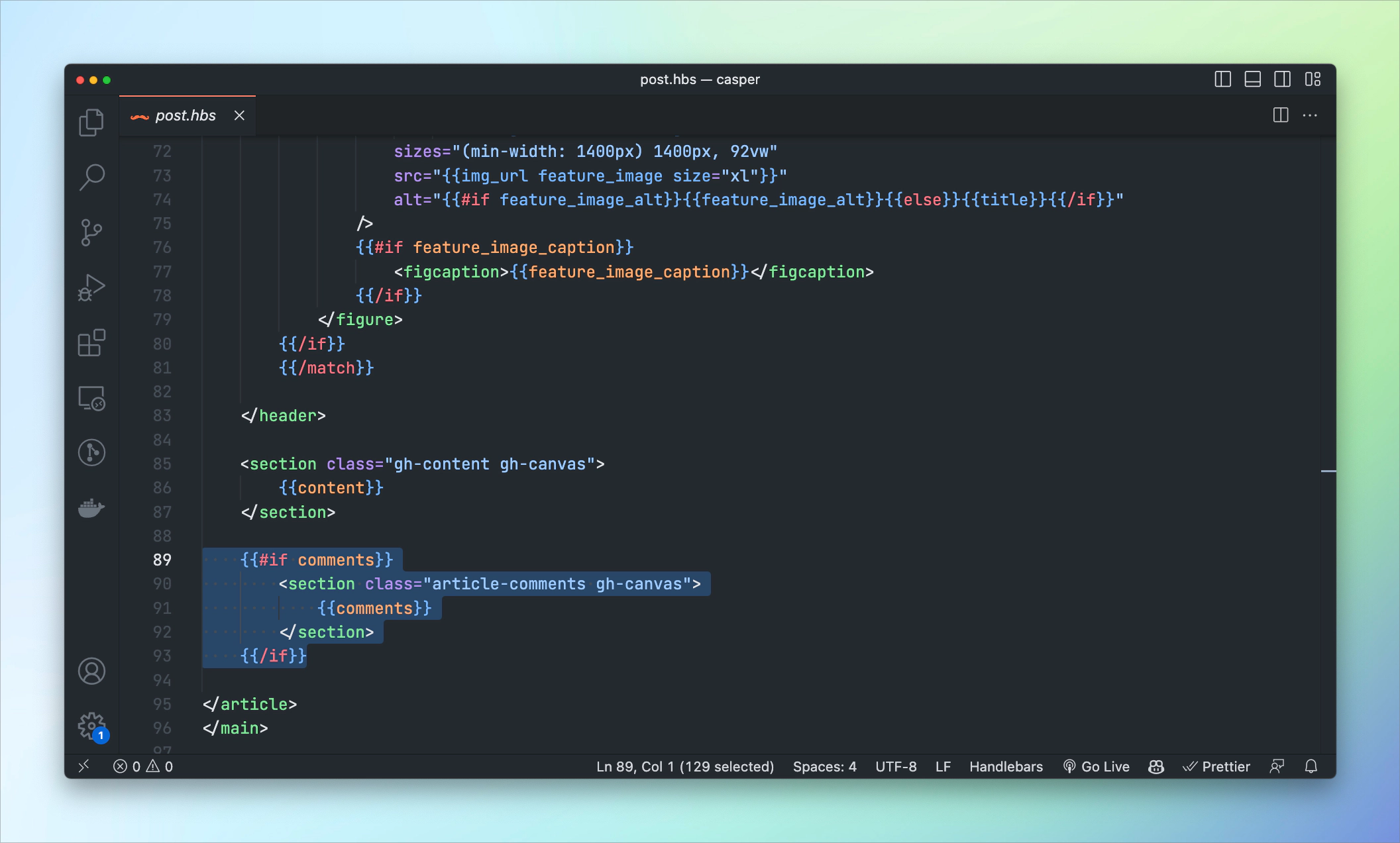 A good spot for this code is after the content in the template file. In Ghost’s official themes, remove the {{#if comments}} block and replace the {{comments}} helper with your Disqus code: