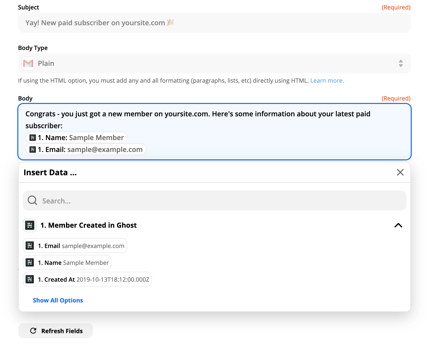 You can send these alerts to any number of email addresses, and create any kind of message as your subject line and body. You can also insert dynamic data from Ghost, such as a members name and email address.